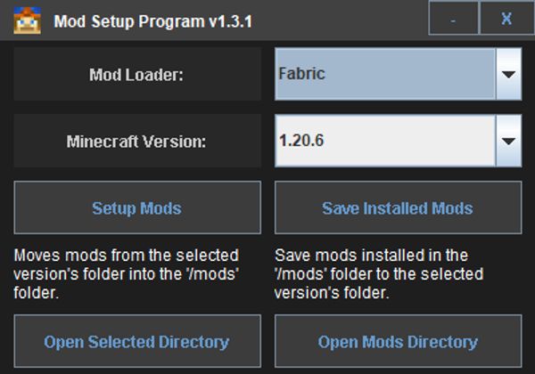 The Mod Setup Program for Minecraft is a utility designed to simplify the organization and management of mods for the game. It creates a central directory for mods and offers options to select different mod loaders (such as Fabric, Forge, NeoForge, or Quilt) and Minecraft versions. Users can easily move mods, back them up, and access specific mod folders for streamlined management.